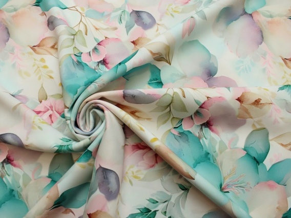 Pastelowy wzór w kwiaty nadaje materiałowi lekkości i romantycznego charakteru, dzięki czemu projekty wykonane z tej tkaniny prezentują się wyjątkowo kobieco.