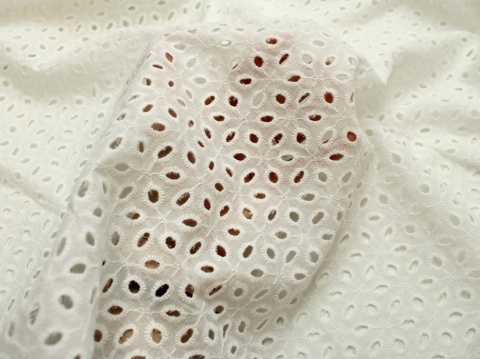 Bawełna haftowana z haftem angielskim (ang. broderie anglaise) to wyjątkowy rodzaj tkaniny bawełnianej zdobionej ażurowym haftem – zazwyczaj w postaci delikatnych kwiatów, liści, kółek lub falistych wzorów. Jest to klasyka wśród haftów, łącząca prostotę z elegancją i romantycznym charakterem.