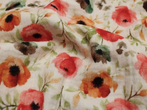 Piękny bawełniany, dwuwarstwowy muślin w wyjątkowym wzorze romantycznych maków na beżowym tle. Wzór wyjątkowy, bo maki wyglądają jak namalowane pastelami. Świetnie sprawdzi się na romantyczne sukienki, bluzki i inne projekty.